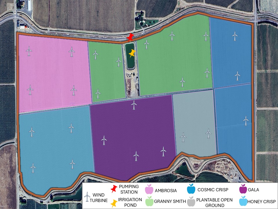 This organically farmed orchard includes 256.86 ± orchard acres per crop insurance records, which consists of 235.20 ± acres currently planted to apples and 21.66 ± acres of open, plantable ground. Current varieties include Ambrosia, Cosmic Crisp, Gala, Granny Smith, and Honey Crisp. The farm is direct operated by the current landowner using a professional orchard management team and the fruit is delivered to various local packing sheds.